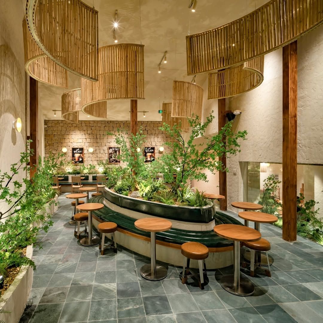 Điểm đặc biệt của kỹ thuật thi công là khả năng uốn cong tre thành những khung vòm mềm mại, tạo nên kết cấu mái và lam chắn vừa chắc chắn, vừa mang tính nghệ thuật. Những mối nối tre được xử lý thủ công tỉ mỉ, giữ cho toàn bộ cấu trúc liền mạch, không chỉ đáp ứng công năng mà còn mang lại cảm giác tự nhiên, gần gũi.