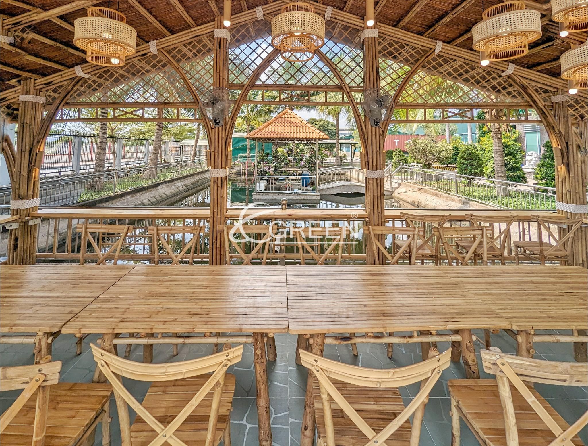 Bên hông ngôi nhà tre sân vườn, còn được trang bị khu vực rửa ly chén, một góc nhỏ của một khu bếp mini, phục vụ rất tốt cho các buổi tiệc. Ngoài ra nội thất được trang bị là bàn và ghế tre tầm vông được gia công bởi những người thợ thủ công lành nghề tại Egreen Living, đã mang lại sự tinh tế và hài hoà cho tổng thể không gian của ngôi nhà tre sân vườn.