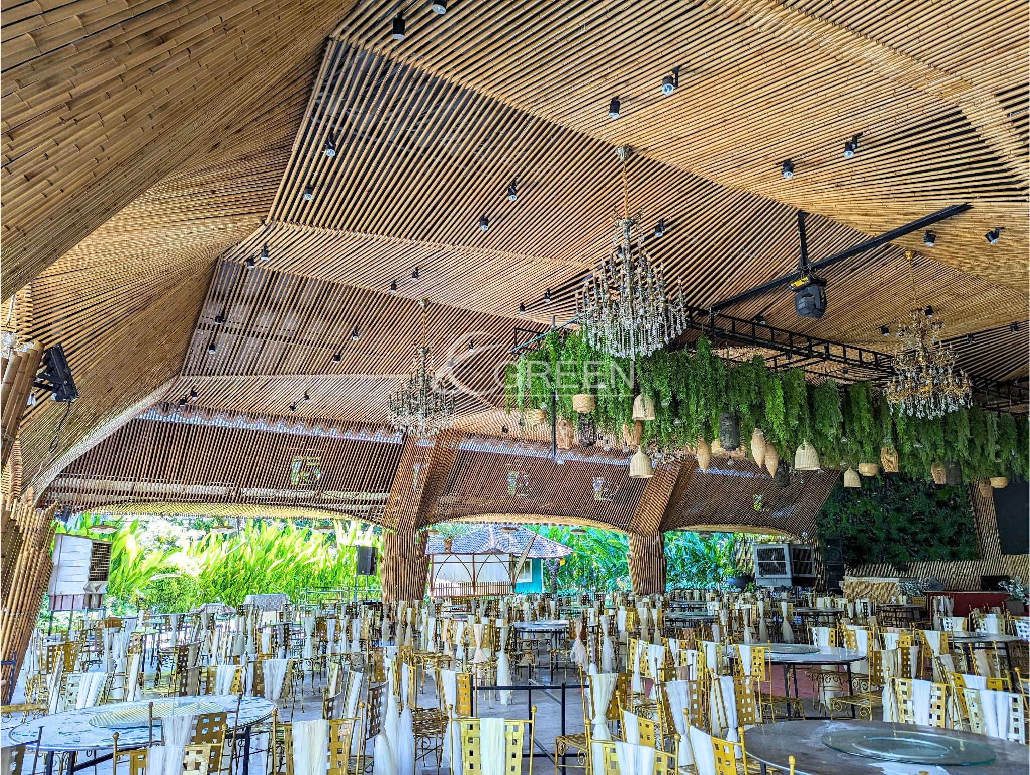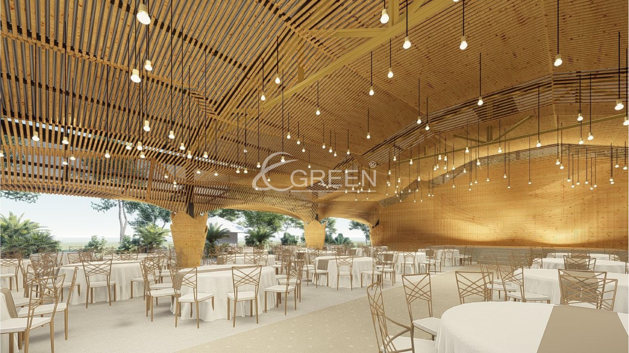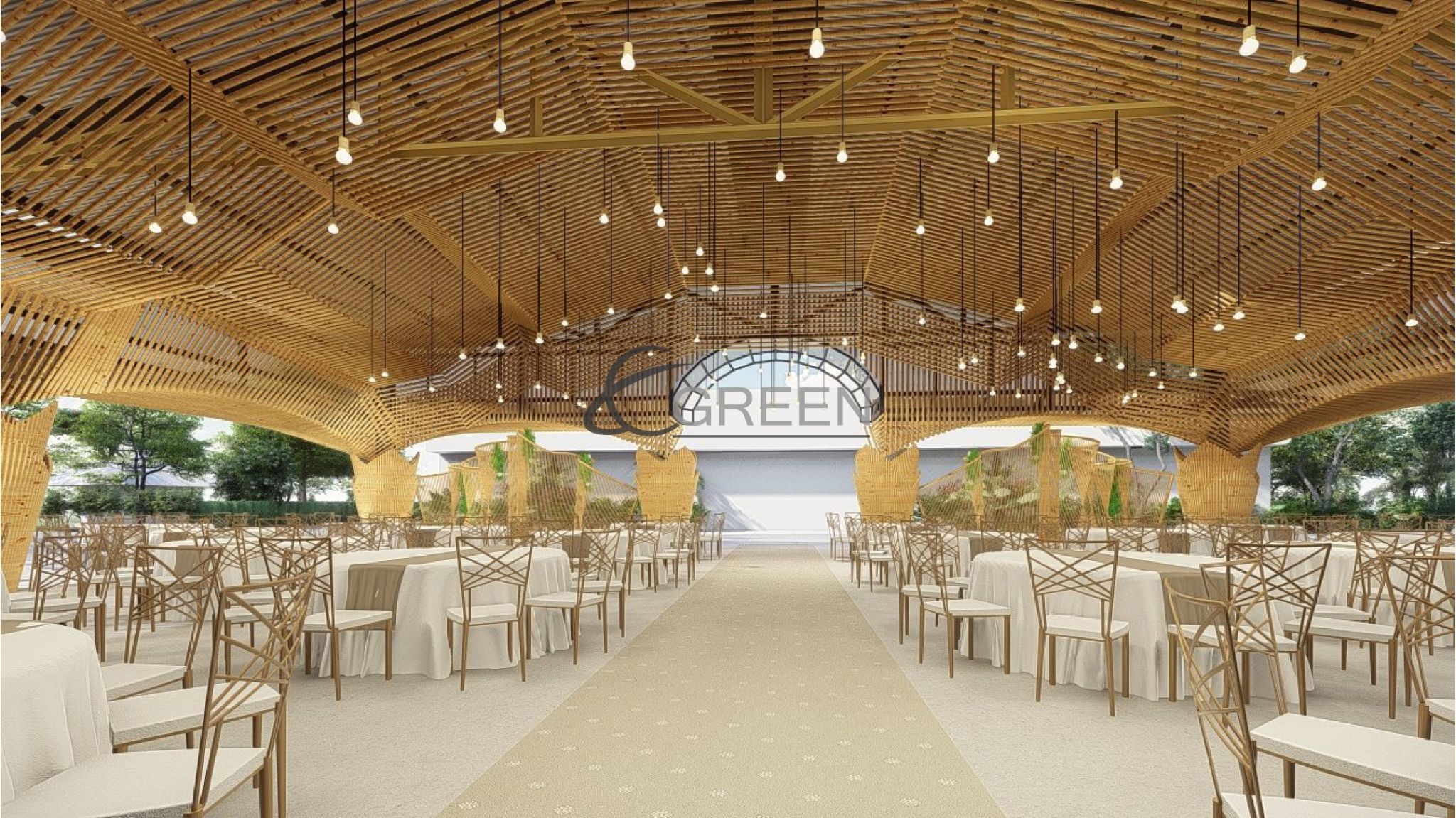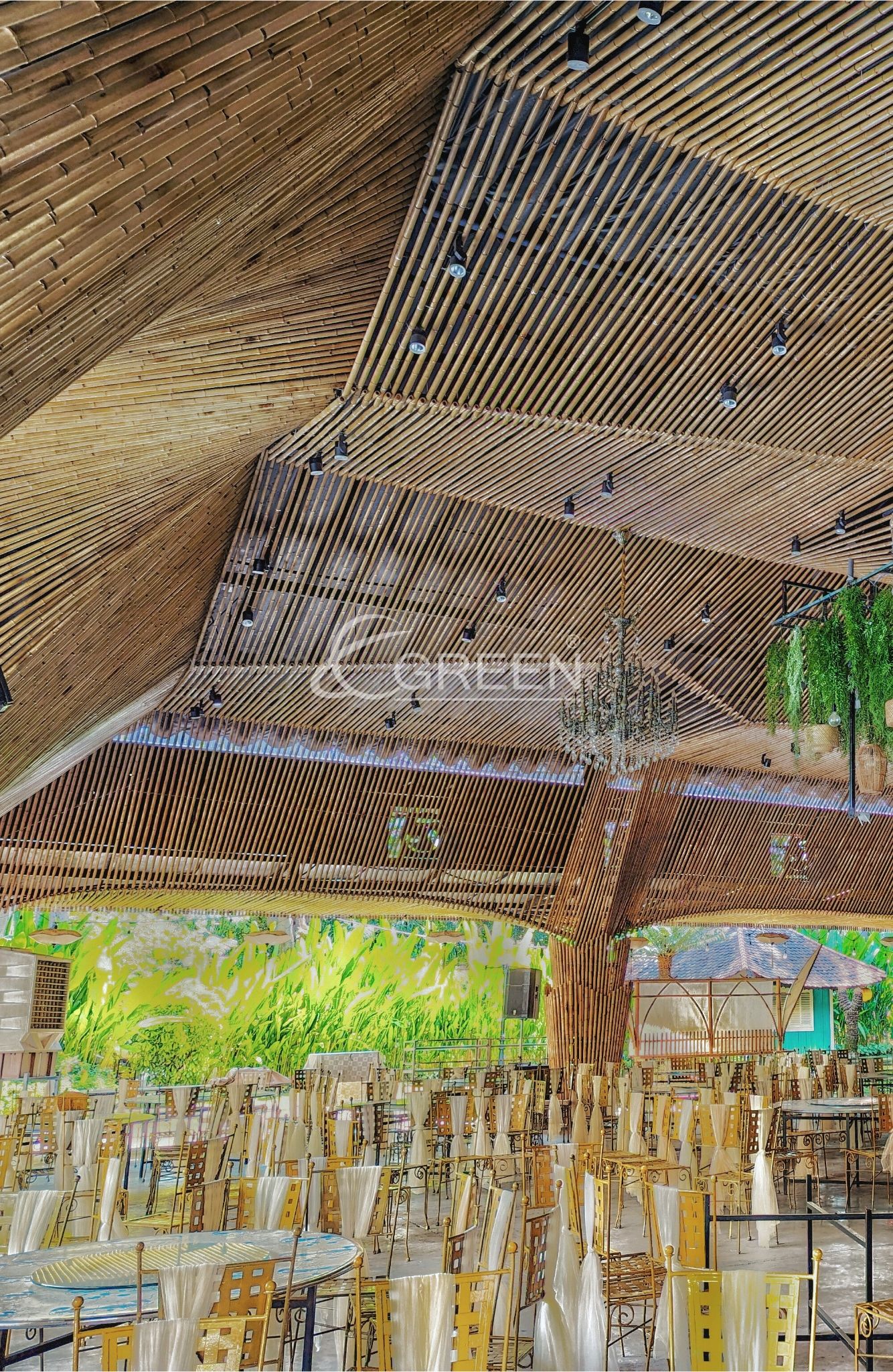 Dự án với 10 trụ cột chính, một con số thích hợp không quá nhiều để thực khách có thể dễ dàng di chuyển trong không gian của buổi tiệc. Trần được ốp trúc với hiệu ứng vòng cung, tạo nên một cảm giác mượt mà và dễ chịu. Màu sắc vàng và nhẹ nhàng của vật liệu trúc, khiến cho các buổi tiệc trở nên ấm áp và vui vẻ hơn bao giờ hết. Phương án sử dụng đèn nền kết hợp, cũng được đội ngũ E-Green chú ý và sử dụng. Dự án trong tương lai sẽ là địa điểm tổ chức các buổi lễ trang trọng, tiệc cưới và hội họp thu hút quần thể cư dân tại Quận 10 và các khu vực lân cận tại Thành phố Hồ Chí Minh.
