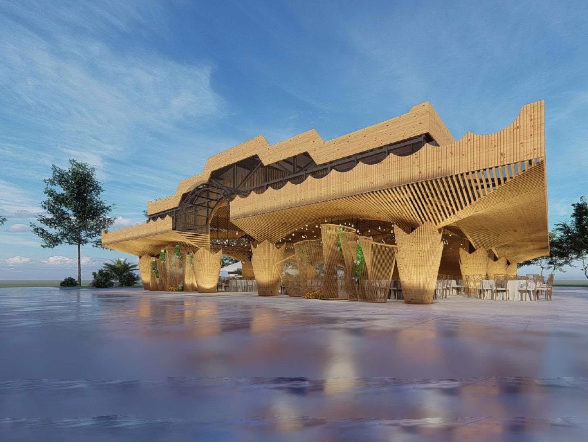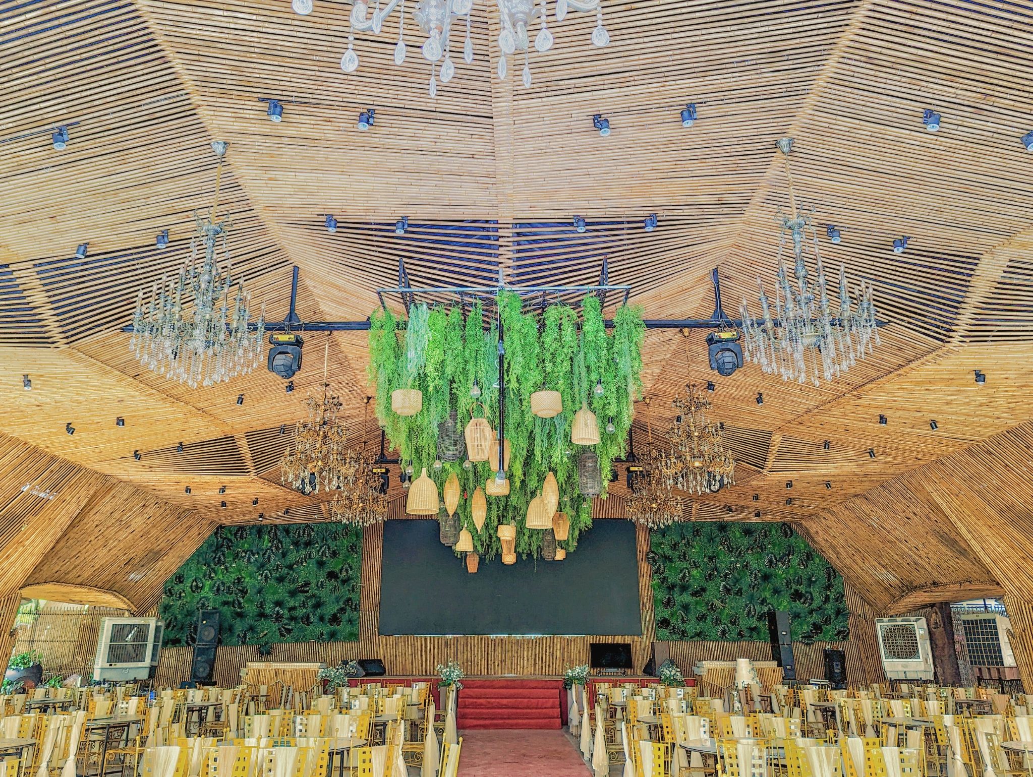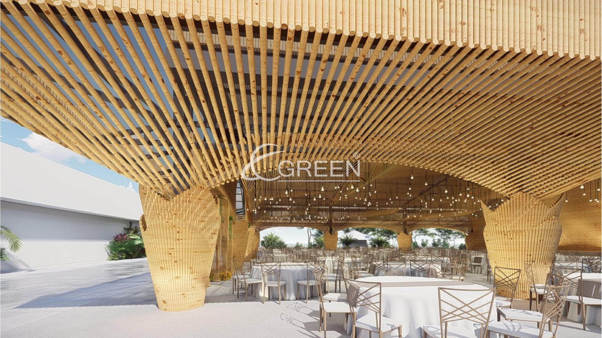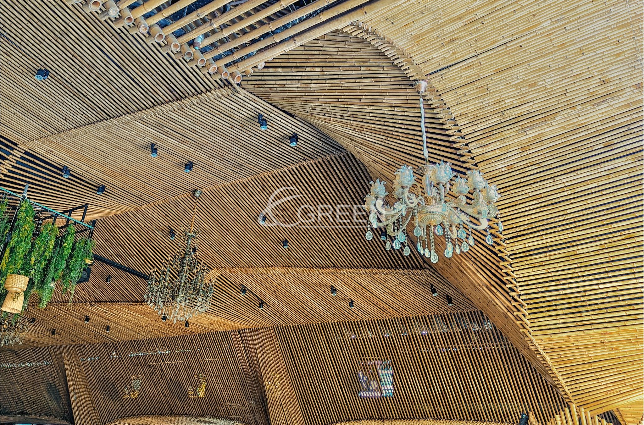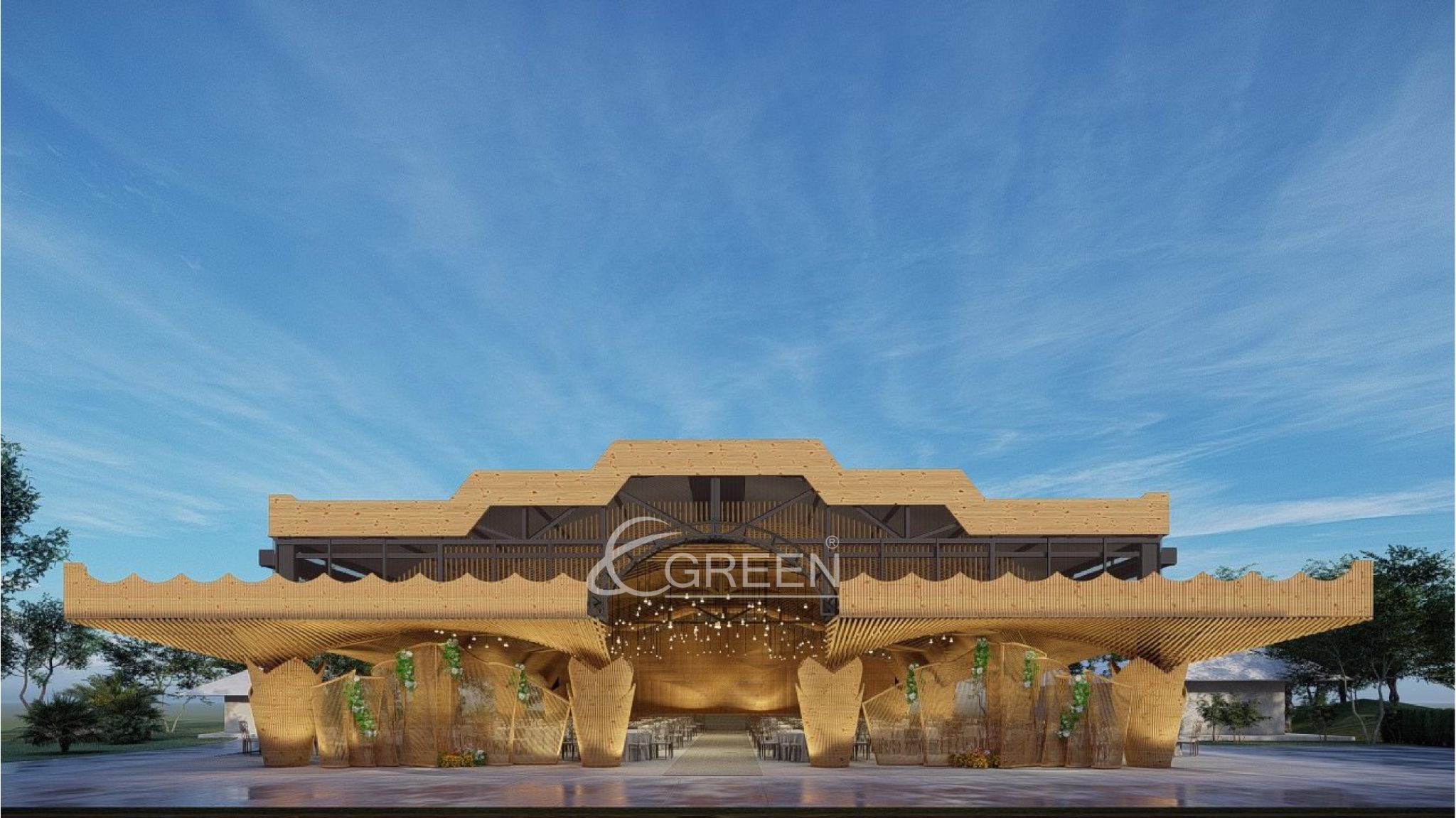 Dự án với 10 trụ cột chính, một con số thích hợp không quá nhiều để thực khách có thể dễ dàng di chuyển trong không gian của buổi tiệc. Trần được ốp trúc với hiệu ứng vòng cung, tạo nên một cảm giác mượt mà và dễ chịu. Màu sắc vàng và nhẹ nhàng của vật liệu trúc, khiến cho các buổi tiệc trở nên ấm áp và vui vẻ hơn bao giờ hết. Phương án sử dụng đèn nền kết hợp, cũng được đội ngũ E-Green chú ý và sử dụng. Dự án trong tương lai sẽ là địa điểm tổ chức các buổi lễ trang trọng, tiệc cưới và hội họp thu hút quần thể cư dân tại Quận 10 và các khu vực lân cận tại Thành phố Hồ Chí Minh.